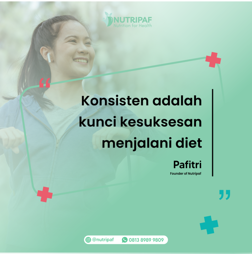 Konsisten adalah Kunci Kesuksesan Menjalani Dietadmin1 nutripafApril 29, 2023Education Siapa yang masih struggle dengan konsistensi?Yap, memulai suatu kebiasaan memang sulit, tapi lebih sulit lagi untuk mempertahankannya 😁Tenang, kamu tidak sendirian.Salah satu hal yang bisa kamu lakukan untuk tetap konsisten adalah : ingat goals di awal ✨