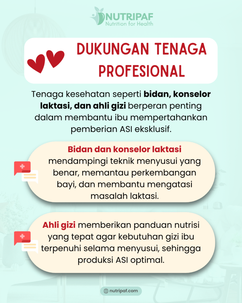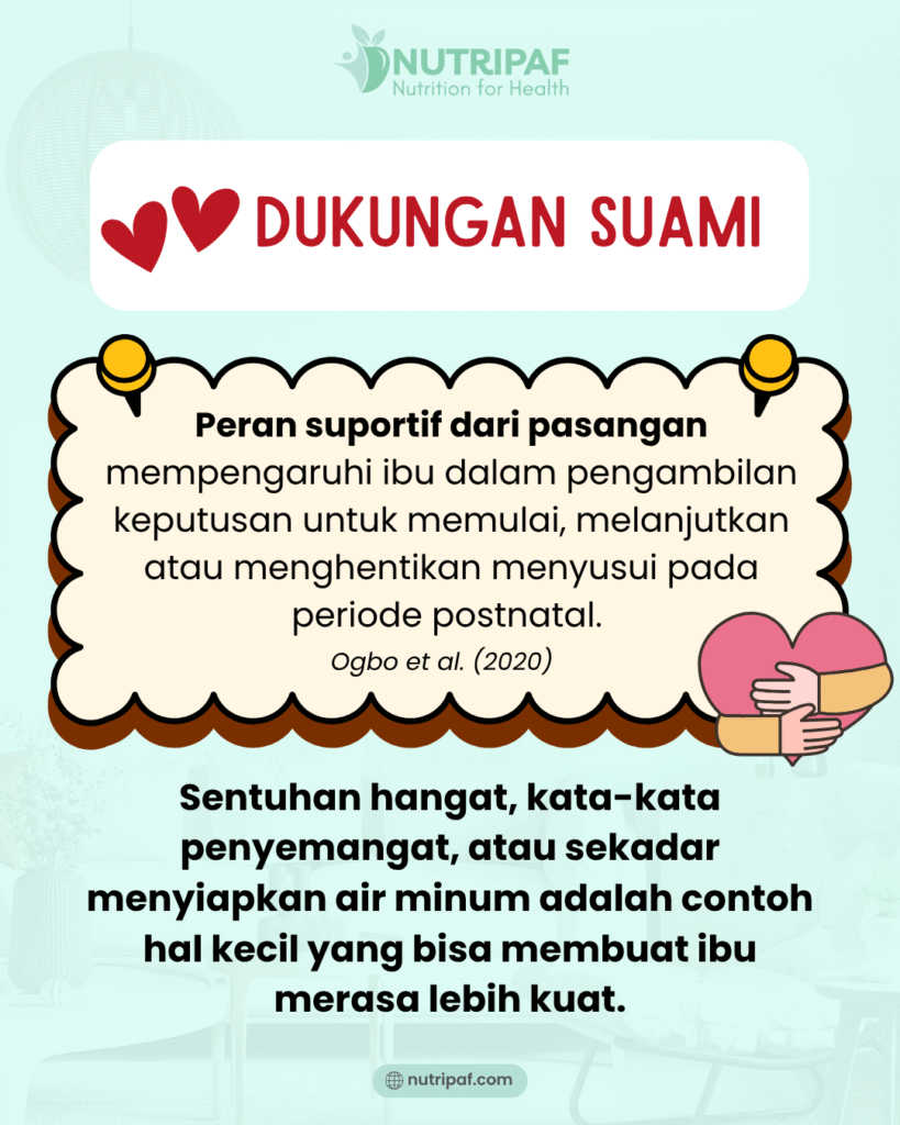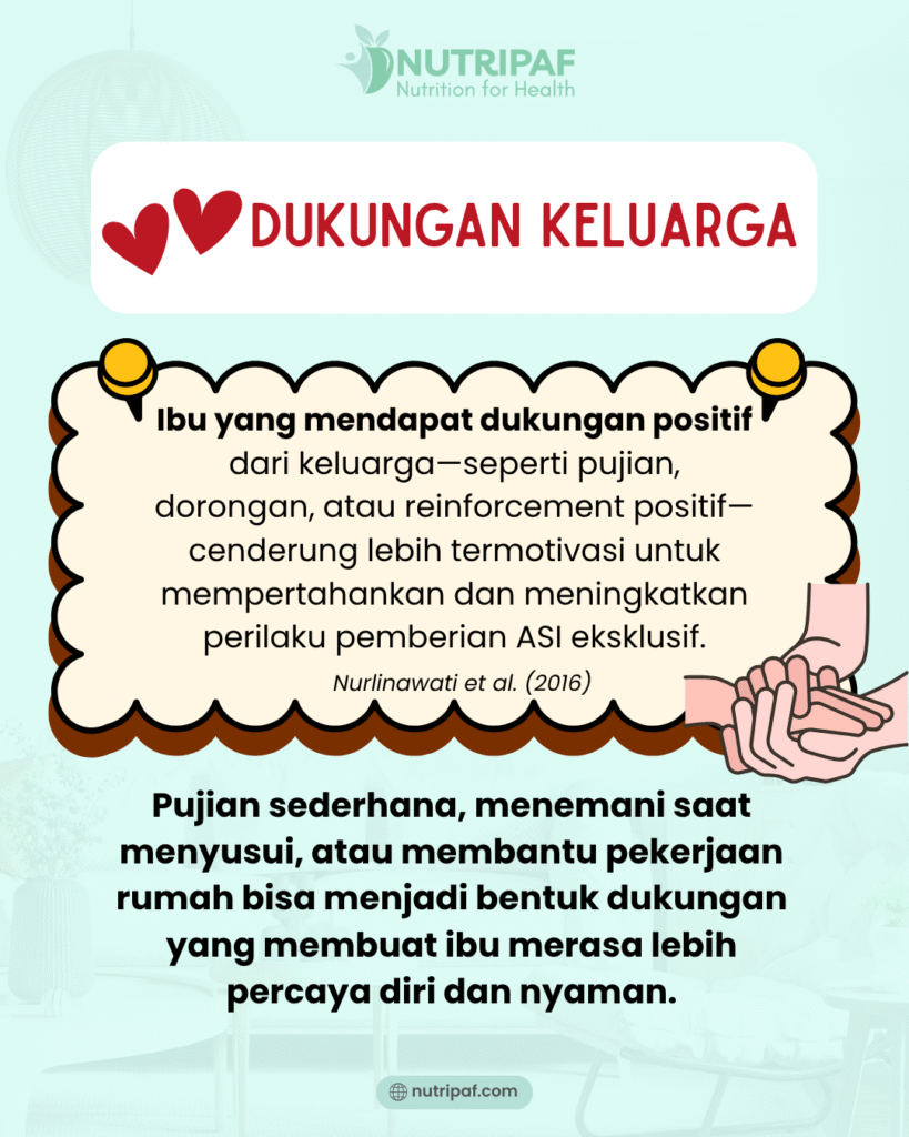 Penelitian menunjukkan, dukungan sosial—baik berupa dorongan emosional, bantuan praktis, informasi, atau penghargaan—dari suami, keluarga, tempat kerja, pengasuh, hingga tenaga kesehatan, memiliki kontribusi nyata terhadap keberhasilan ASI eksklusif, terutama pada ibu bekerja (Ulya 2023).